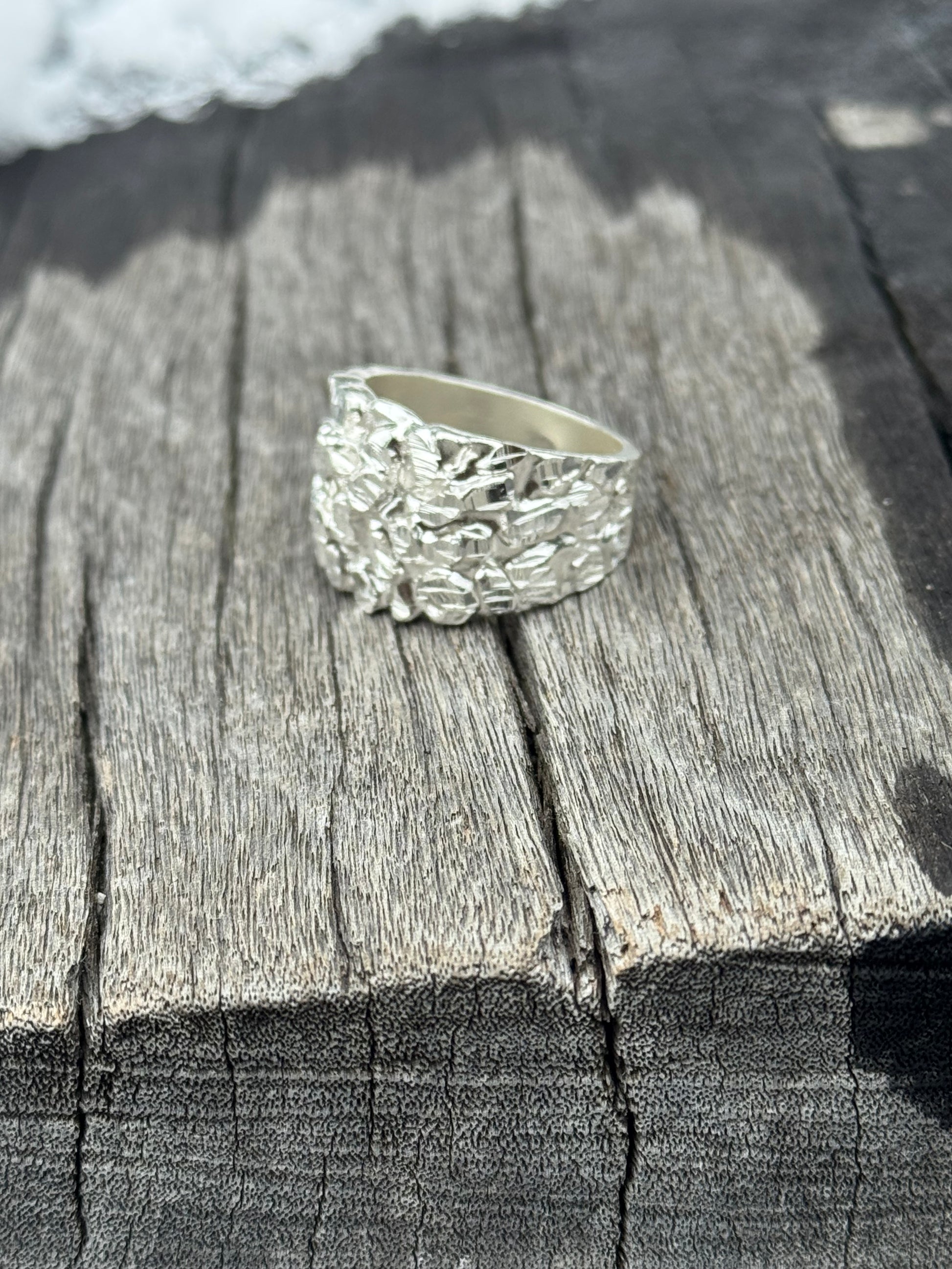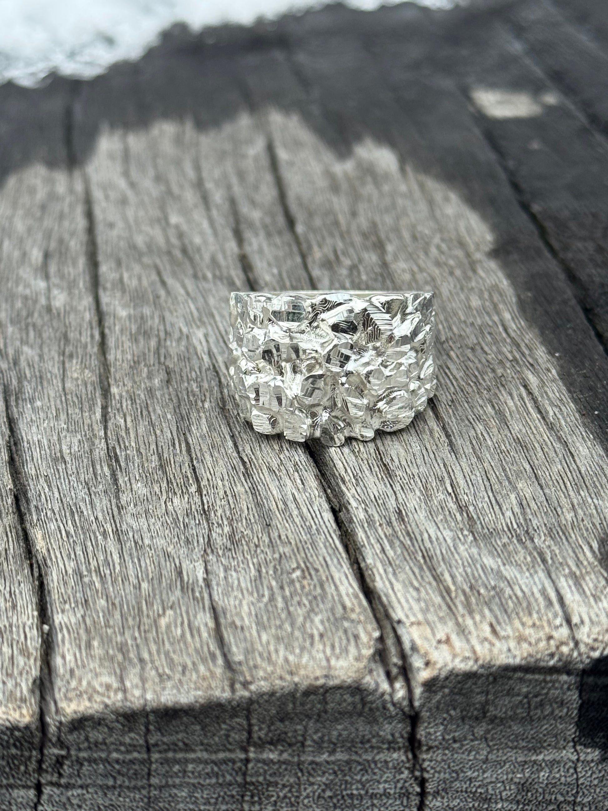 Make a strong statement with this classic nugget-style ring crafted from solid 925 sterling silver. Its bold design captures light beautifully, giving off a confident shine that never goes out of style. Perfect for everyday wear or as a standout piece in your collection.